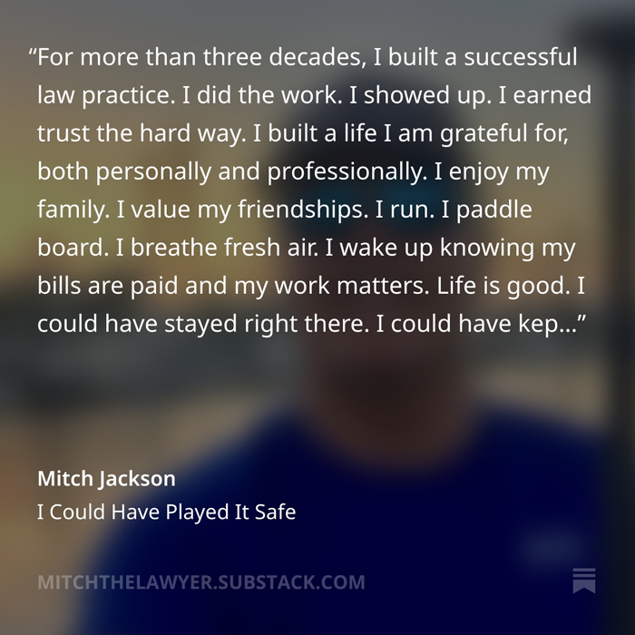 For more than three decades, I built a successful law practice. I did the work. I showed up. I earned trust the hard way. I built a life I am grateful for, both personally and professionally.